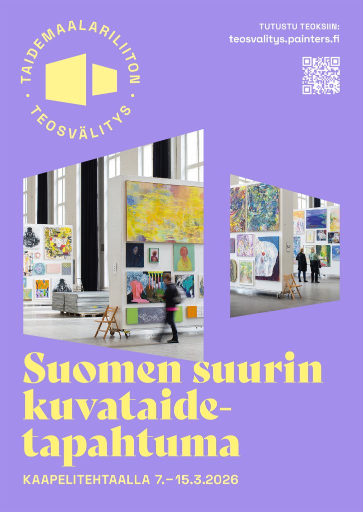 Tervetuloa Taidemaalariliiton Teosvälitykseen! Kaapelitehtaan Merikaapelihalli täyttyy jälleen maaliskuussa tuoreella maalaustaiteella. Valtava vuosittainen myyntinäyttely esittelee teoksia yli 700 ammattitaiteilijalta ympäri Suomea.